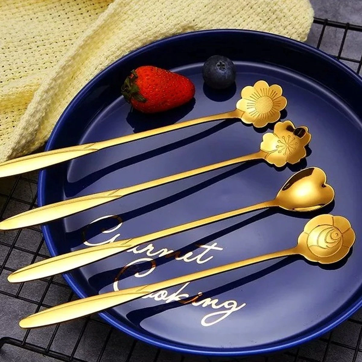 Een set van 4 verschillende lange goudkleurige RVS Bloem Motief Lepels van Fako Bijoux® voor een scherpe prijs. Deze lepels zijn ruim 17cm lang en te gebruiken als lange koffielepel, dessertlepel, ijslepel of als lepel in een lekkere cocktail. Het leuke motief zorgt aan tafel voor een lach op ieders gezicht. Met deze lepel komt u altijd tot de bodem van het glas en hoeft u ook niet bang te zijn dat de lepel onder het schuim of ijs zoekraakt. Geleverd in een velours opbergzakje.