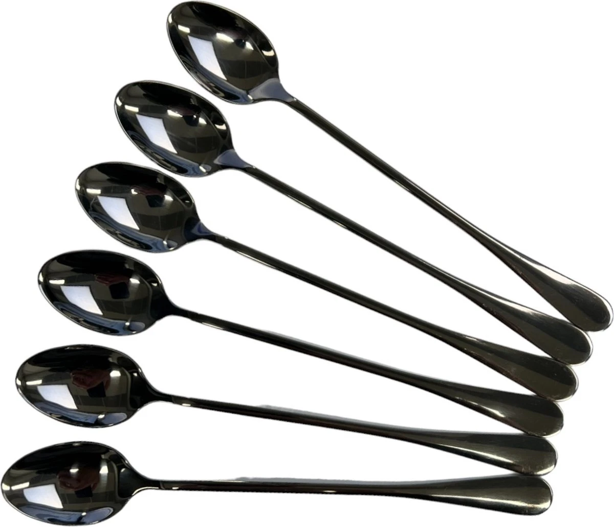 Set van 6 zwarte roestvrijstalen Latte Macchiato lepels. Handig om in lange glazen te roeren of uit te scheppen.