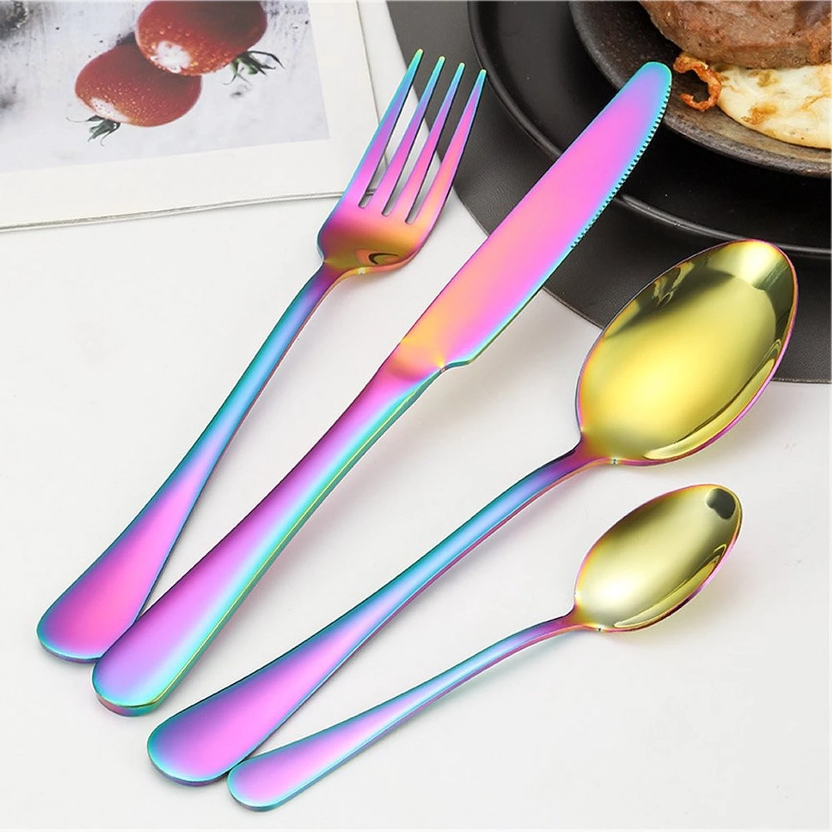 Melili Bestekset, Bestek set 24-delig, 6 persoons bestekset, tafelmes, tafelvork, soeplepel, dessertlepel, roestvrijstalen bestekset, multi-kleur, goud, verguld, zilver, multicolor.