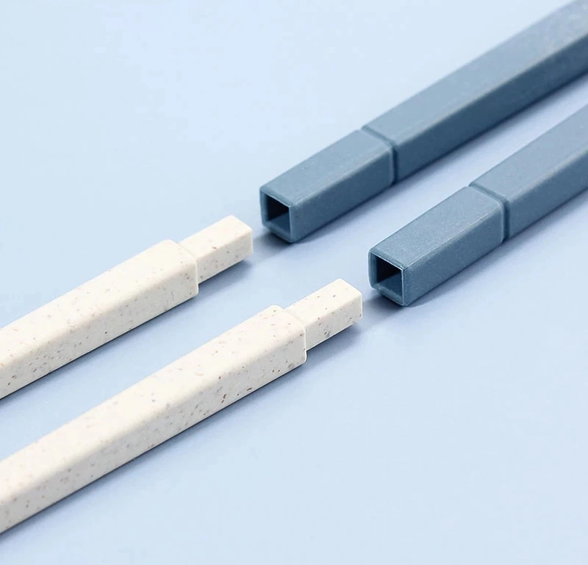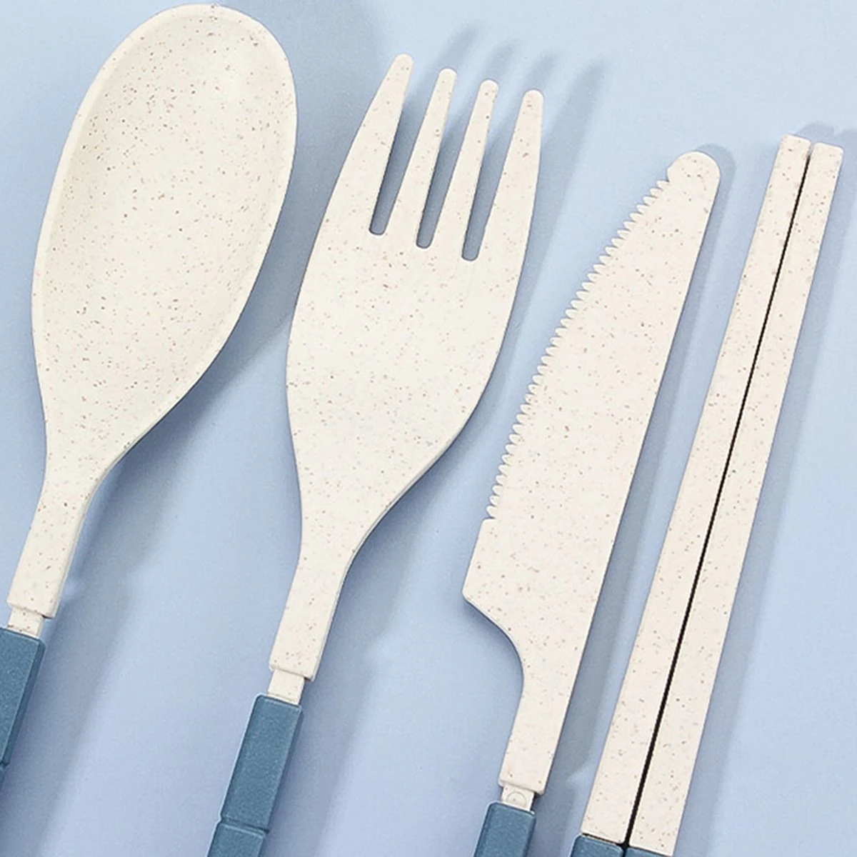 Het bestek bestaat uit een vork, mes, lepel en stokjes. Ze bestaan uit twee delen en zijn gemakkelijk te bevestigen of los te maken. Het bestek is gemaakt van kunststof. De verpakking is 12,8×5,7cm, de stokjes zijn 19cm, het mes is 18×1,7cm, de vork is 17,6×2,7cm en de lepel is 17,7×2,9cm.
